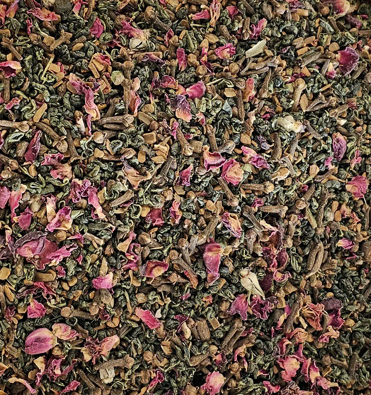 Cinnamon Chips, Gunpowder Green Tea, Cloves, Red Rose Petals, Dandelion Root