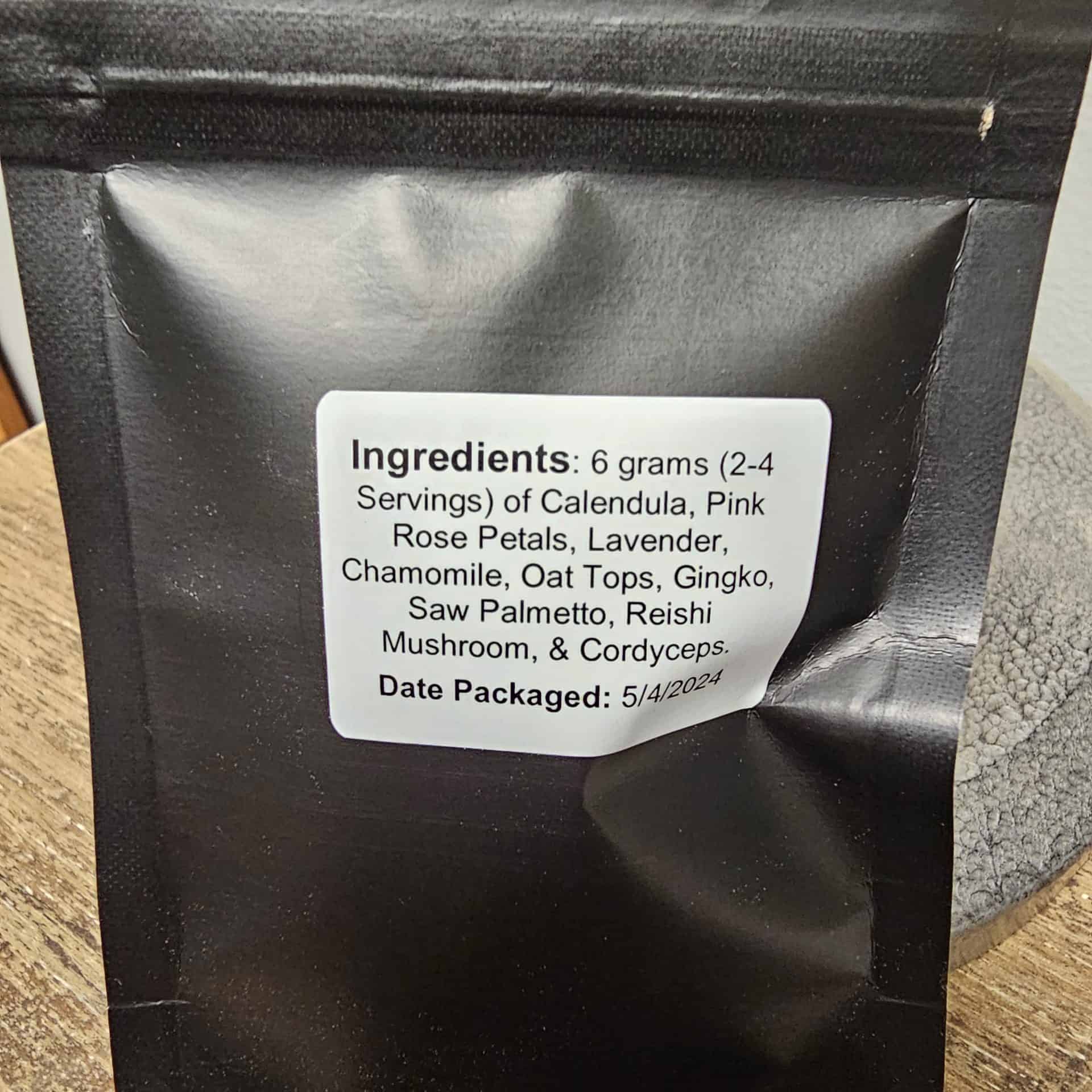 - Ingredients:Â Sample Bag of 6 grams (2-4 Servings) of Calendula, Pink Rose Petals, Lavender, Chamomile, Oat Tops, Gingko, Saw Palmetto, Reishi Mushroom, & Cordyceps. (10 Cups = 20 grams & 20 Cups = 40 grams)