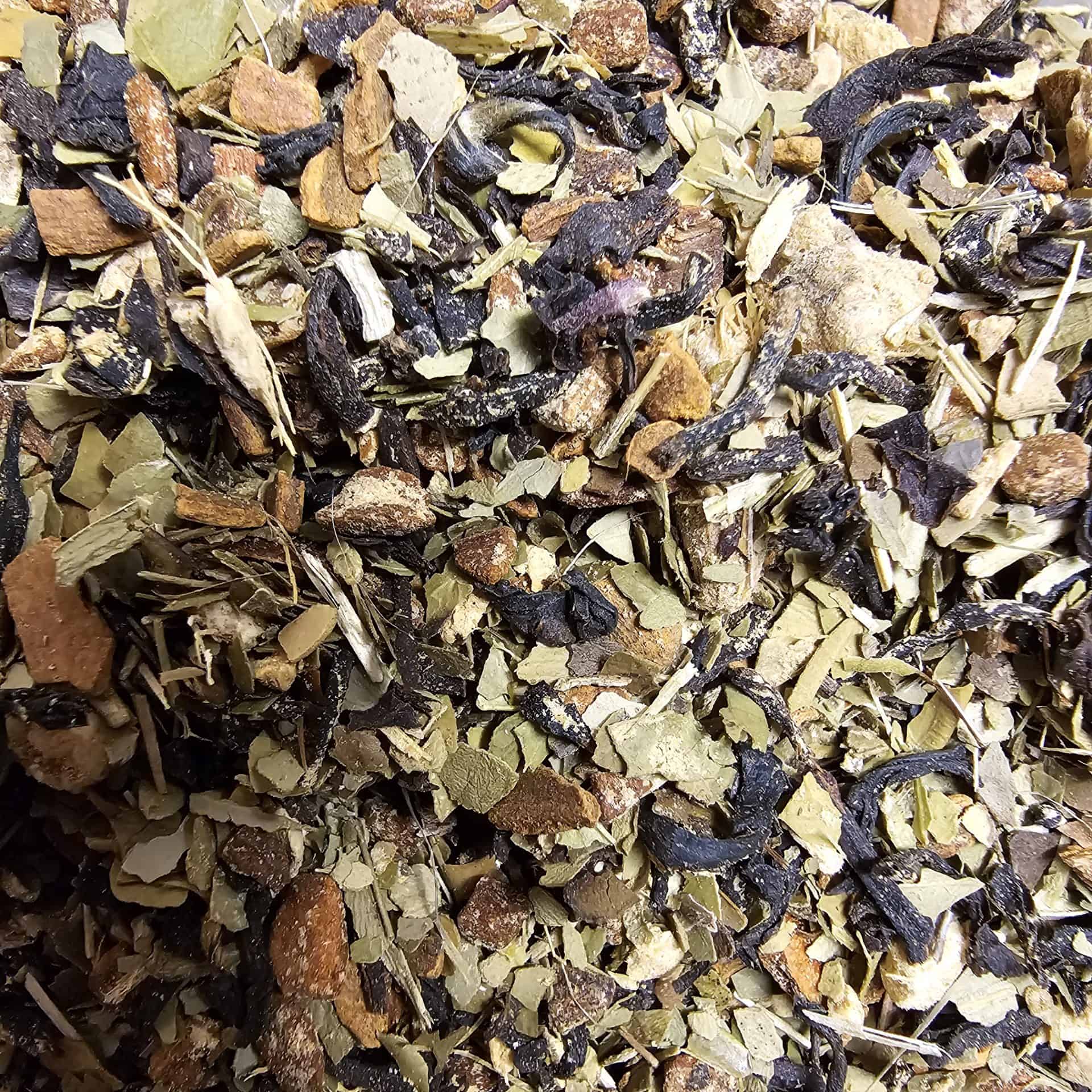 This is our energy tea blend. The oolong brings a little hint of floral as the anise star, ginger, and cinnamon contribute a nice peppery flavor. To help mask the bitterness of ginseng, we have added orange flavoring to help merge this energy boosting bitter into a sweeter tang. This tea contains caffeine.
