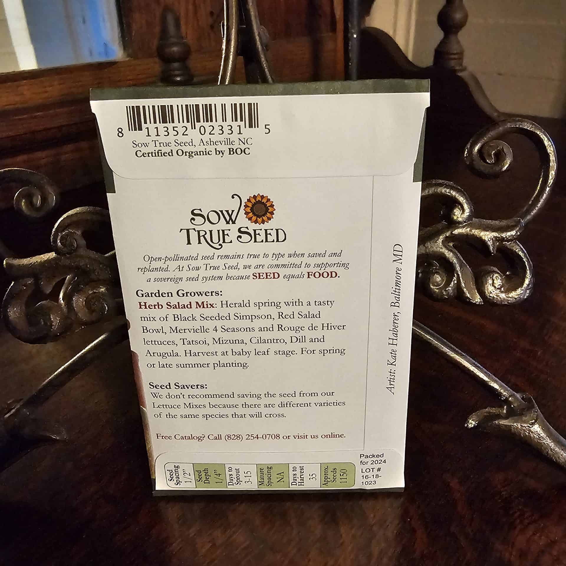 Herald spring with a tasty mix of Black Seeded Simpson, Red Salad Bowl, Mervielle 4 Seasons and Rouge de Hiver lettuces, Tatsoi, Mizuna, Cilantro, Dill and Arugula. Harvest at baby leaf stage. For spring or late summer planting.