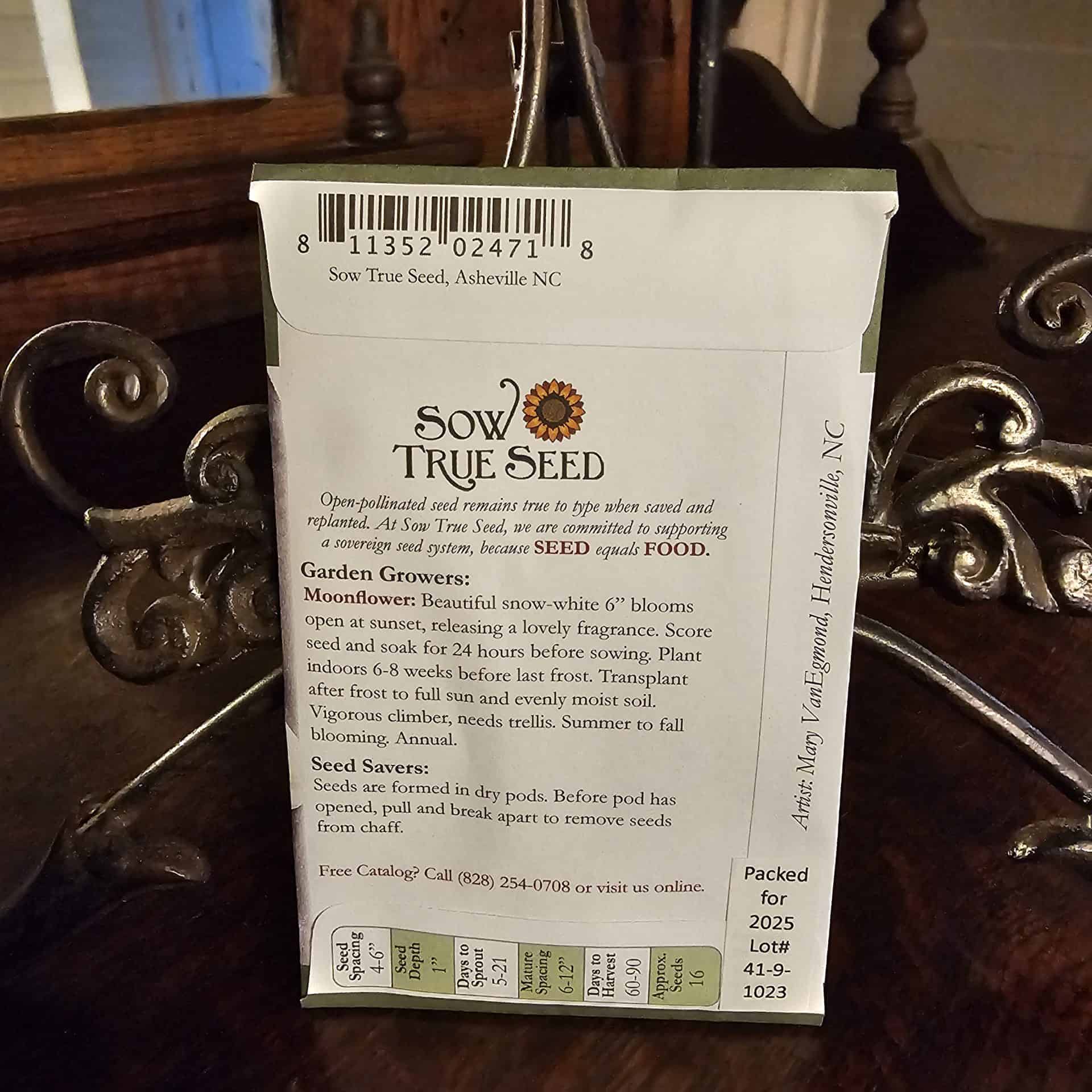 Beautiful snow-white 6″ blooms open at sunset, releasing a lovely fragrance. Score seed and soak for 24 hours before sowing. Plant indoors 6-8 weeks before the last frost. Transplant after frost to full sun and evenly moist soil. Vigorous climbers need trellis. Summer to fall blooming.