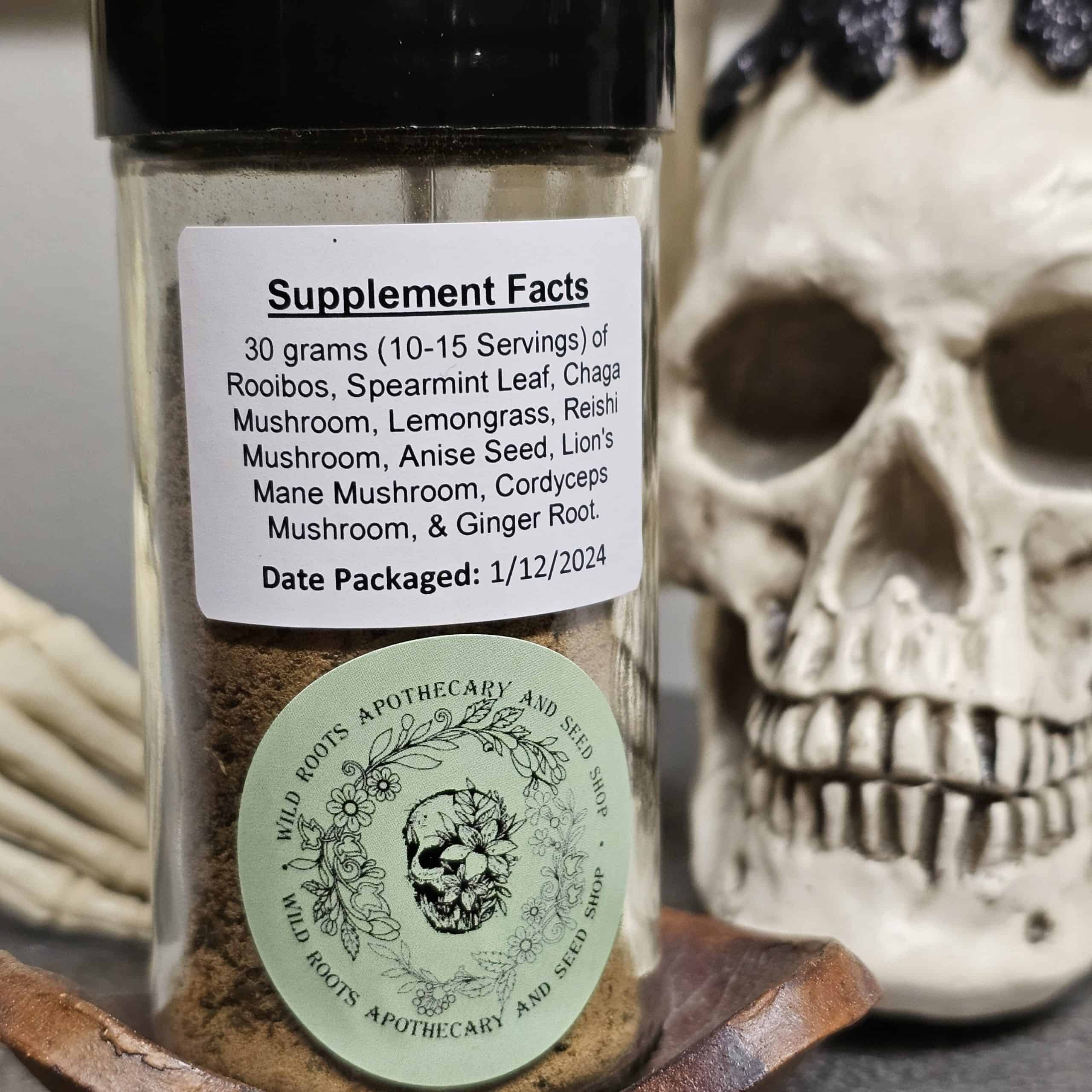 30 grams (10-15 Servings) of Rooibos, Spearmint Leaf, Chaga Mushroom, Lemongrass, Reishi Mushroom, Anise Seed, Lion’s Mane Mushroom, Cordyceps Mushroom, & Ginger Root.
