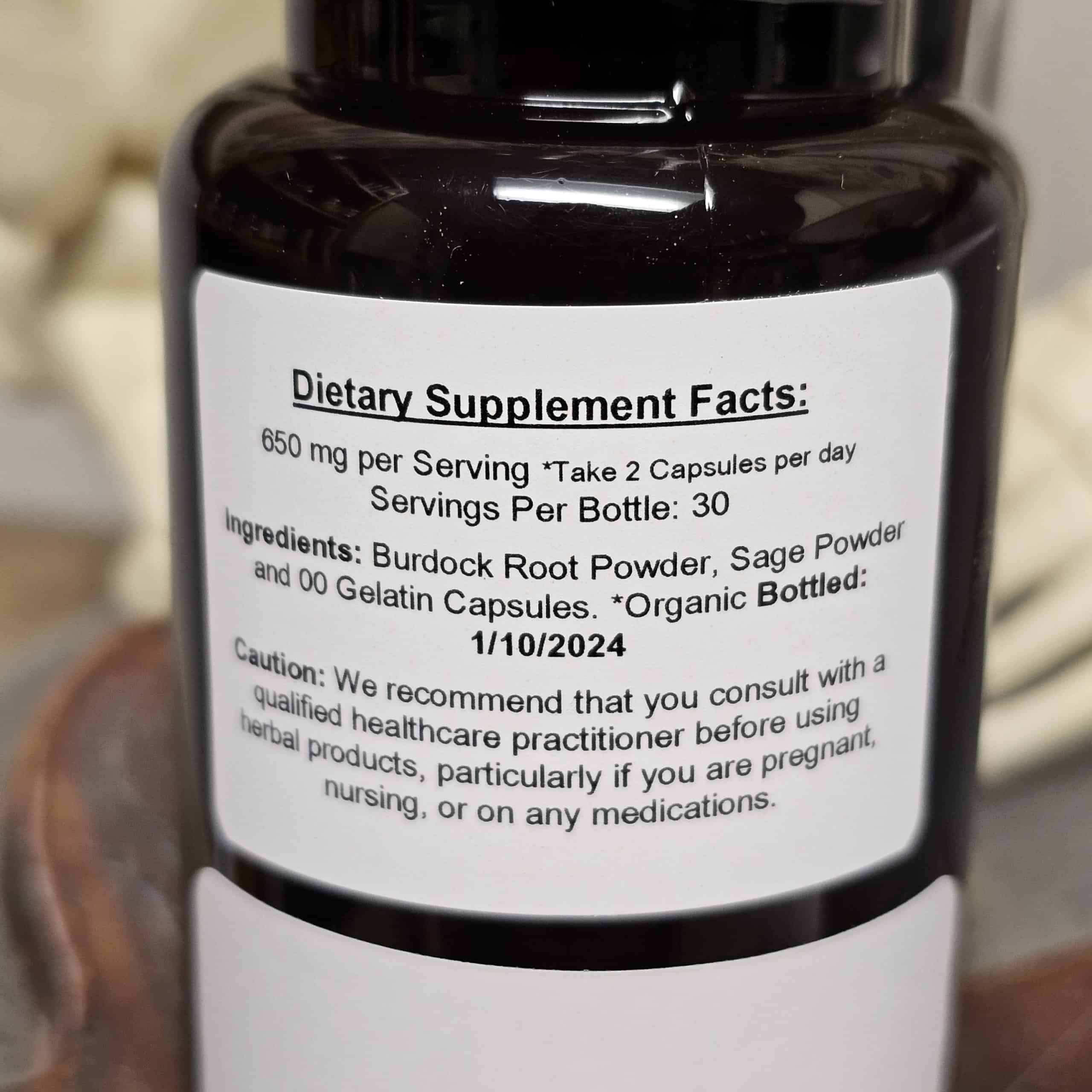 Ingredients: Burdock Root Powder, Sage Powder and 00 Gelatin Capsules. *Organic